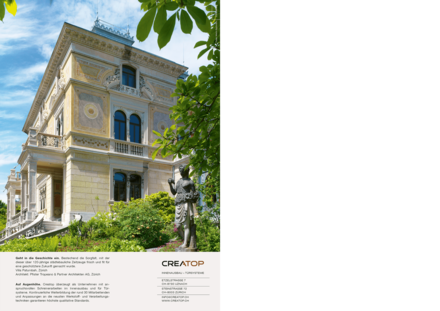 Um Architekten auf diese Fertigkeiten aufmerksam zu machen, wurden das Corporate Design überarbeitet, drei Broschüren mit den besten Referenzen erstellt und bis heute fortlaufend Inserate in einem Fachmagazin geschaltet. www.creatop.ch