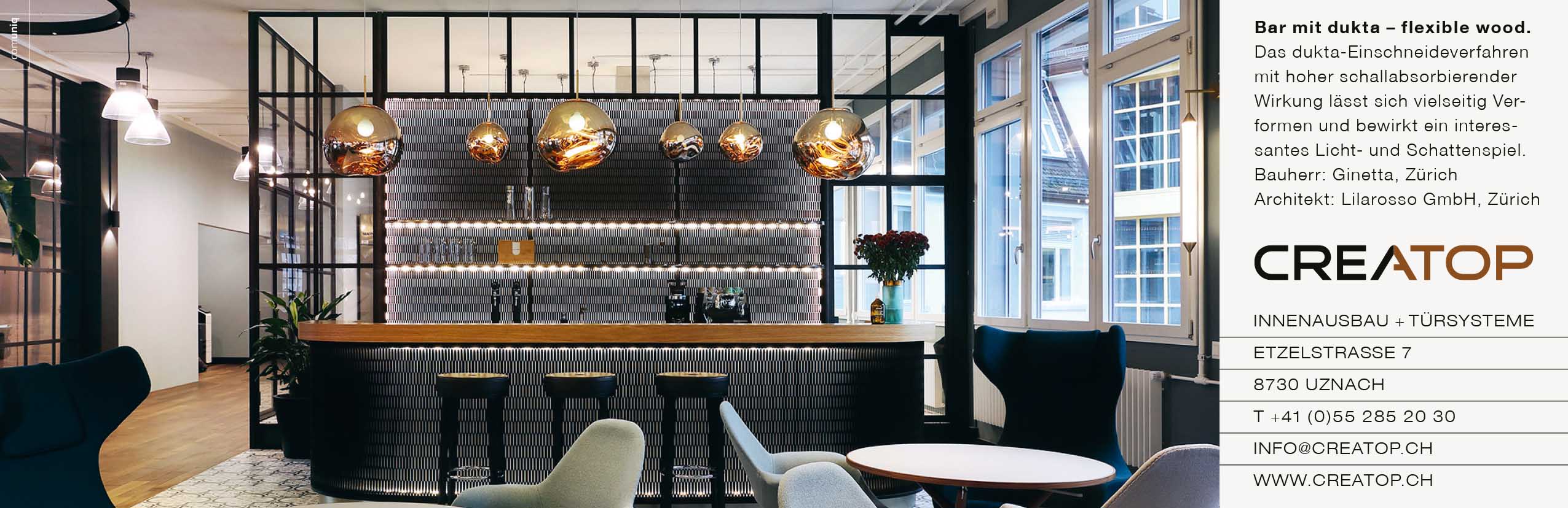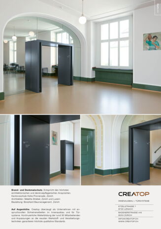 Creatop AG konnte seit der Gründung im Jahr 1995 ihre Schreinerleistung mittels modernen Maschinen und mehr Mitarbeitenden wesentlich verbessern und bietet heute hohe Qualität im Innenausbau, Türsystemen und Brandschutz.