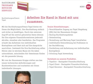 Die Haussmann-Gruppe hat sich 2008 neu strukturiert. Um die Kunden dabei nicht zu stark zu irritieren, haben wir ein neues Corporate Design entwickelt, welches sich stark ans Alte anlehnt und doch für Veränderung steht. Seither wird die Broschüre laufend aktualisiert und die Website à jour gehalten. haussmann-treuhand.ch